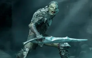 With bowie knives made of vibranium, Warpath steps on what is left of a destroyed Sentinel. With an eagle on his chest and his belt buckle, he dons his classic red and blue costume. From Iron Studios comes their Warpath BDS Art Scale 1/10 statue.